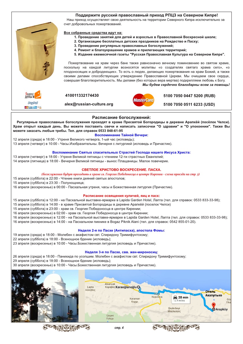 Газета «Русская Православная Культура на Северном Кипре» распространяется бесплатно. Вы можете её найти в начале каждого месяца в крупных супермаркетах Кирении (Гирне) и её окрестностей (Каранаолу, Алсанджака, Лапты, Чаталкёй), в Искеле. А также в русских магазинах и службах быта Северного Кипра.