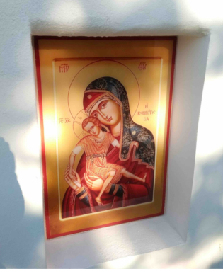 Икона-витраж Киккской Богородицы украсит нишу, которая расположена справа от входных дверей в церковь, а витраж Креста разместится над входными дверями в храм.